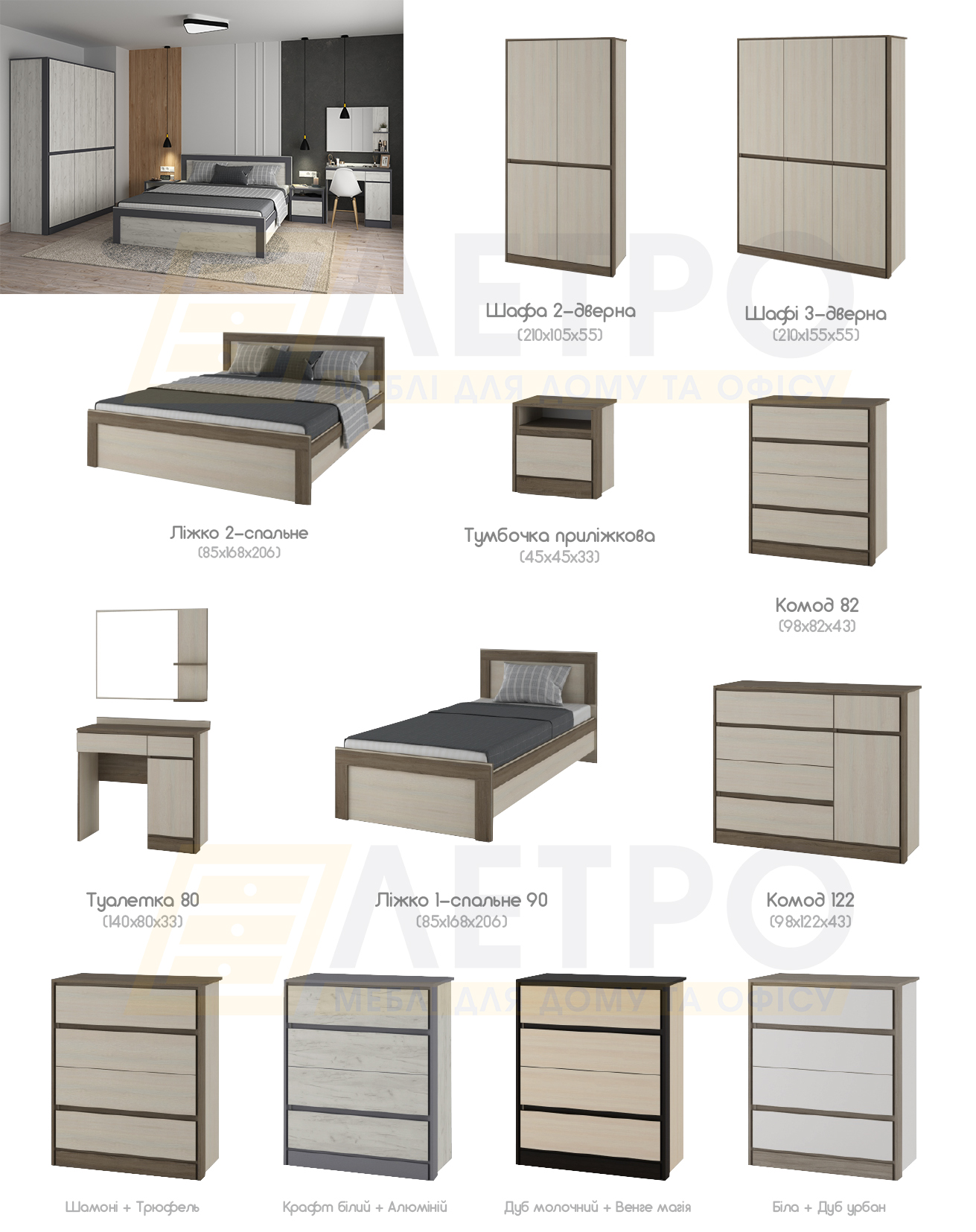 | Колір (відтінок) меблів | Німфеа альба, Горіх лісовий, Дуб трюфель, Венге, Дуб сонома, Бук Баварія, Білий, Дуб Крафт Білий, Вільха Гірська, Дуб крафт золотий, Графіт, Сірий, Дуб молочний, Яблуня локарно |