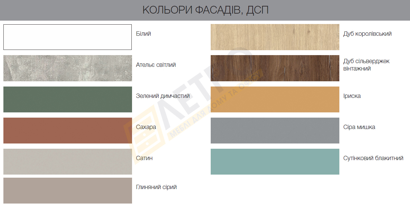 | Колір (відтінок) меблів | Білий, Блакитний, Зелений, Капучіно |
