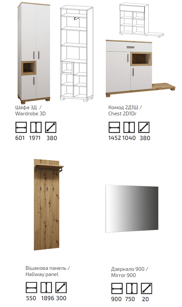 Передпокій складається з таких елементів (шир*вис*глуб):