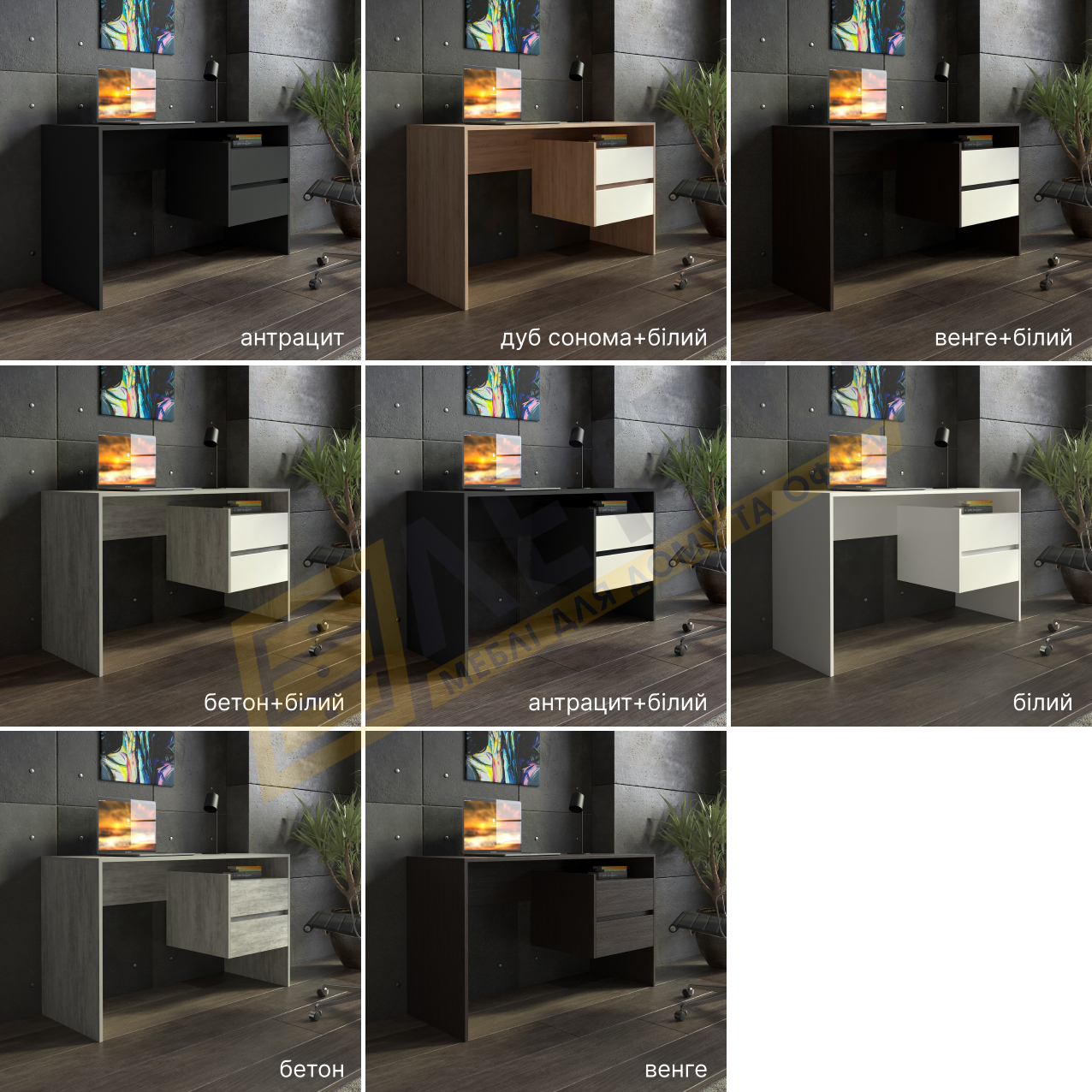 | Колір (відтінок) меблів | Антрацит, Білий, Білий + дуб сонома, Бетон, Бетон + білий , Венге, венге темний, Венге темний + білий, Дуб сонома, Дуб сонома + білий, Сірий, Урбан Лайт |