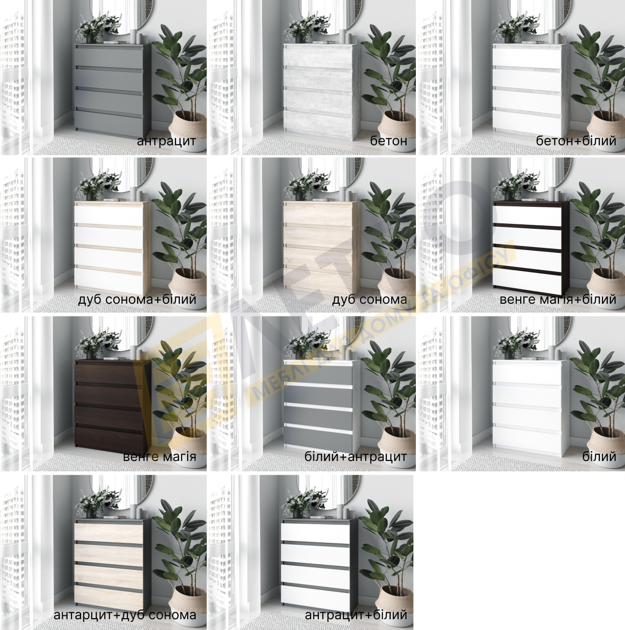 | Колір (відтінок) меблів | Антрацит, Бетон, Венге, Дуб сонома + білий, Дуб Крафт Білий, Дуб сонома, Бетон + білий , Дуб крафт золотий, Білий, Венге темний + білий, Сірий, Венге магія |