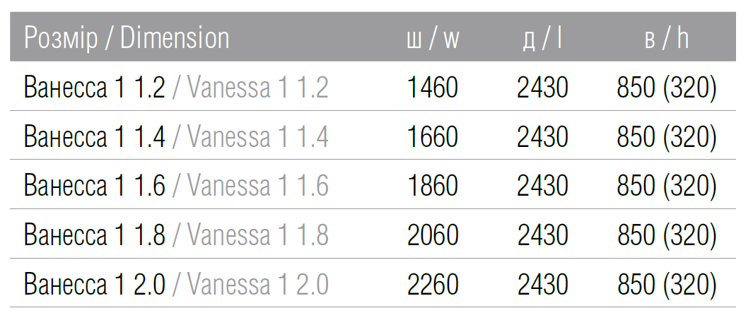 Ліжко представлене в декількох розмірах: 120х200, 140х200, 160х200, 180х200 і 200х200, що дає змогу вибрати відповідний варіант для будь-якої спальні, від компактної до просторої.