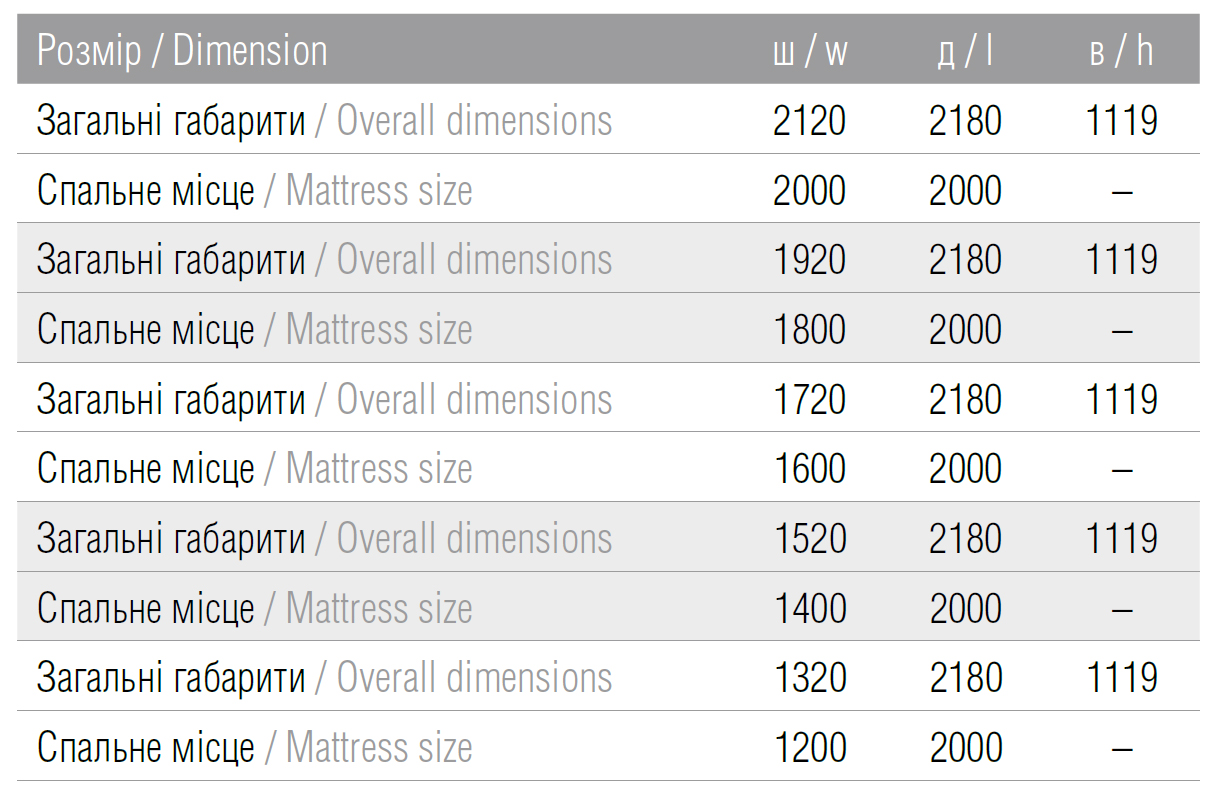 Ліжко представлене в декількох розмірах: 120х200, 140х200, 160х200, 180х200 і 200х200, що дає змогу вибрати відповідний варіант для будь-якої спальні, від компактної до просторої.