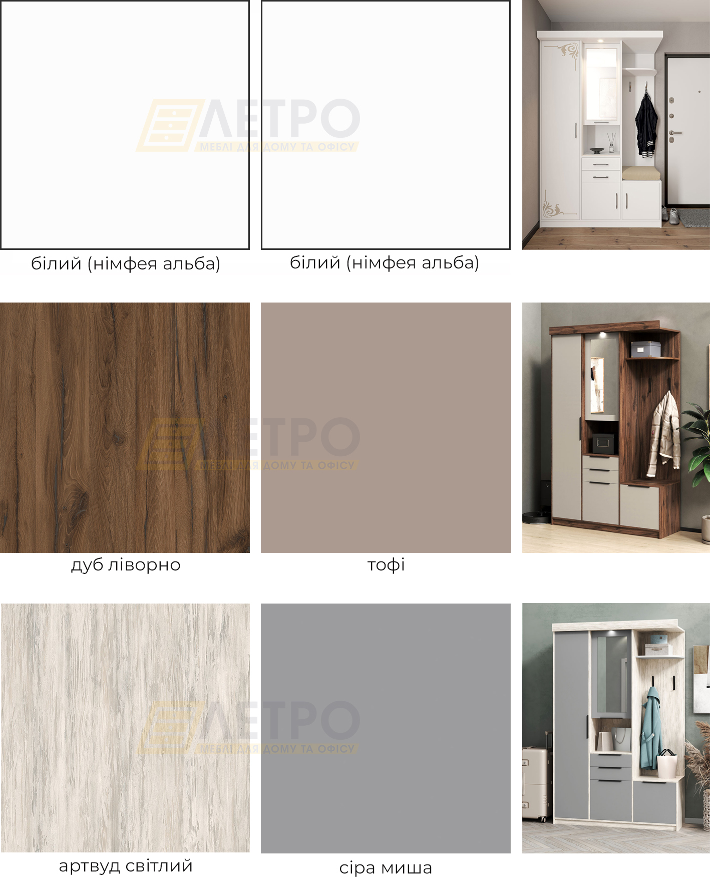 Сучасний передпокій Силует 1 - це вдале поєднання стилю, функціональності та зручності. Модель виготовляється в трьох варіантах: комбінація відтінків дуб ліворно і тоффі, артвуд світлий і сіра мишка, а також в однотонному білому виконанні. Така різноманітність дає змогу підібрати варіант, який гармонійно впишеться в будь-який інтер'єр. Для виробництва використовується ламінована ДСП товщиною 16 мм, яка не містить шкідливих смол і клеїв, що робить передпокій безпечним для здоров'я.