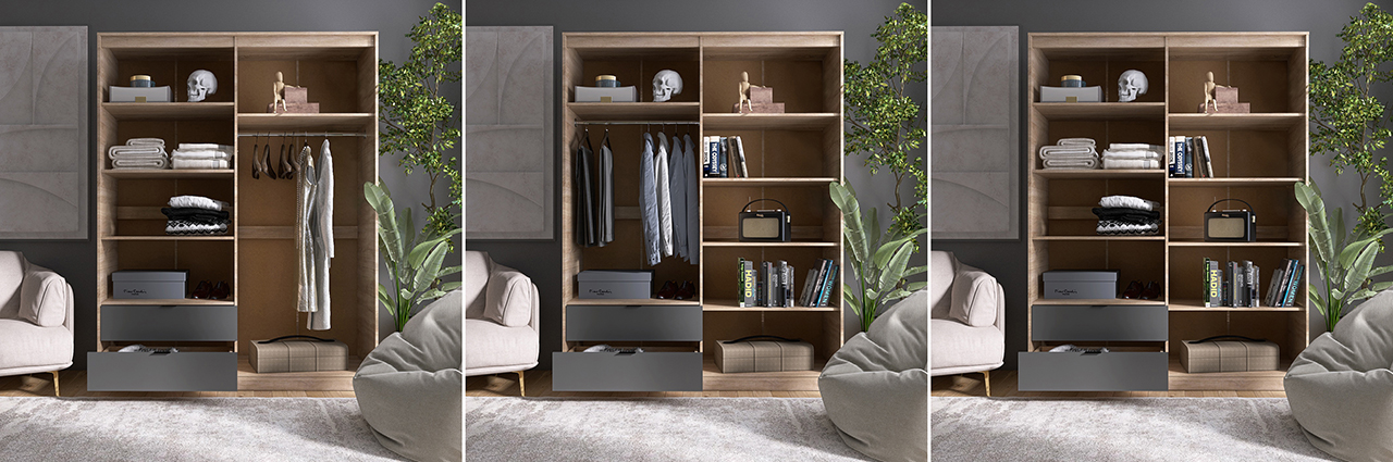 Шафа оснащена двома секціями: кожна включає штангу для одягу на вішалках і полицю для складених речей. У нижній частині розміщені дві шухляди, придатні для зберігання білизни та різних дрібних предметів.