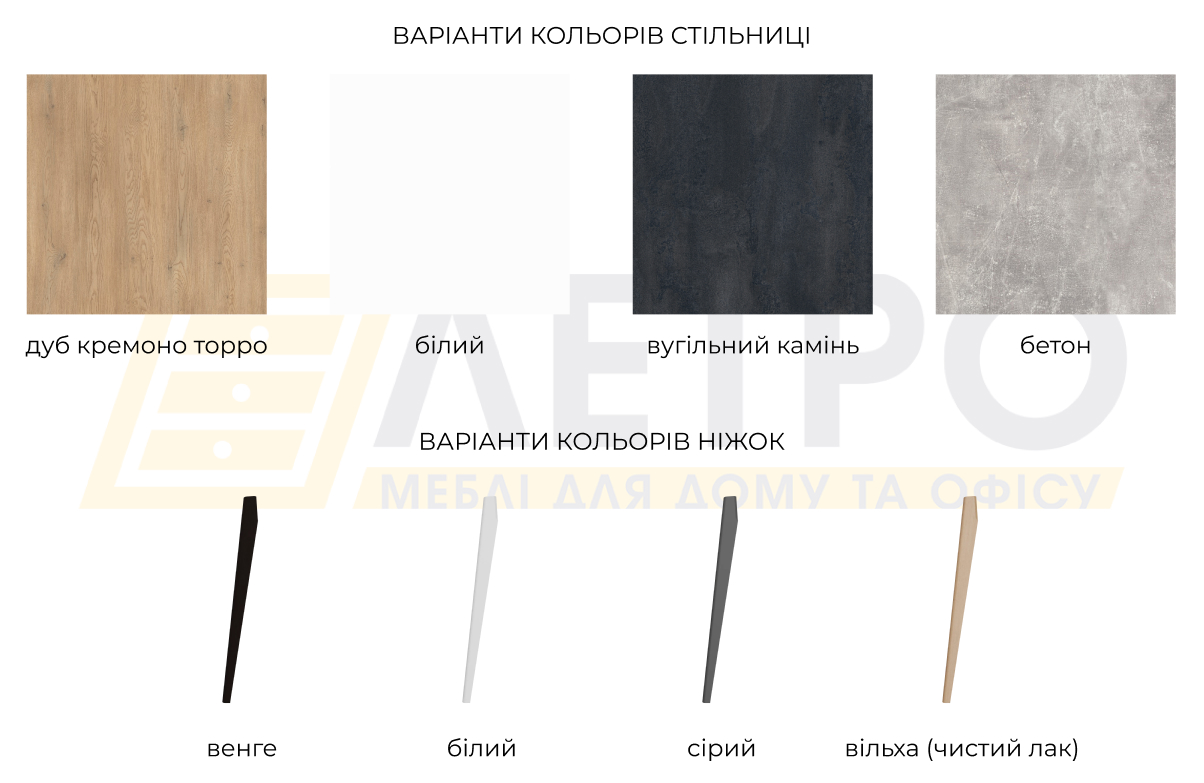 Виробник дає можливість вибирати окремо колір стільниці та ніжок