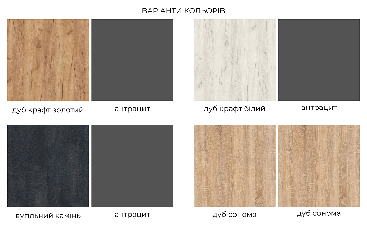 Модель представлена в трьох комбінованих варіантах: дуб крафт золотий з антрацитом, дуб крафт білий з антрацитом, вугільний камінь з антрацитом. Також доступний однотонний варіант у кольорі дуб сонома.