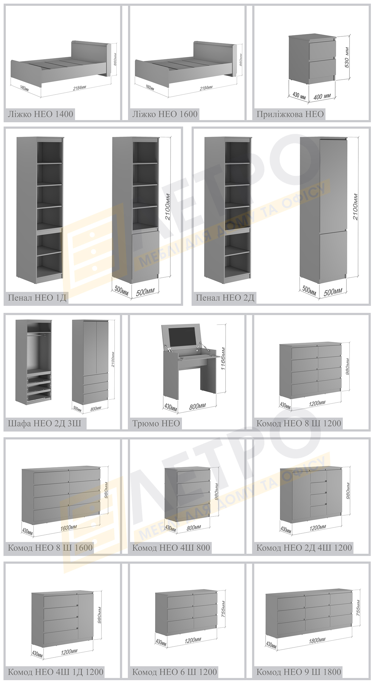 Усі елементи модульної системи меблів Нео:
