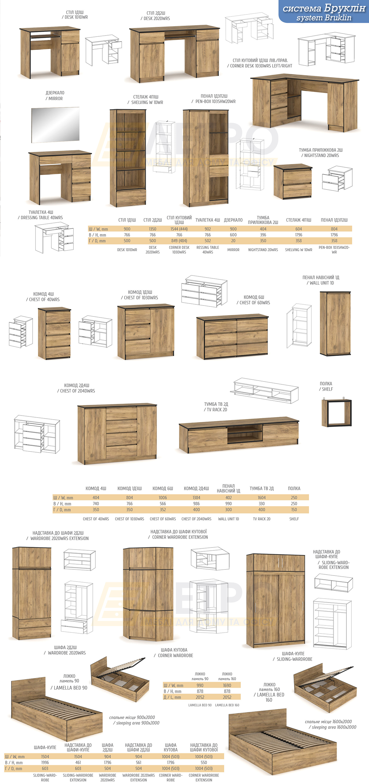 Комод виготовлений із ламінованої ДСП товщиною 16 мм, що не містить шкідливих смол і клеїв. Доступний у двох кольорах на вибір — білому та дуб крафт золотий. Є частиною модульної системи Бруклін і може бути доповнений іншими елементами для облаштування спальні в єдиному стилі.