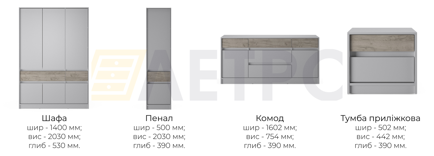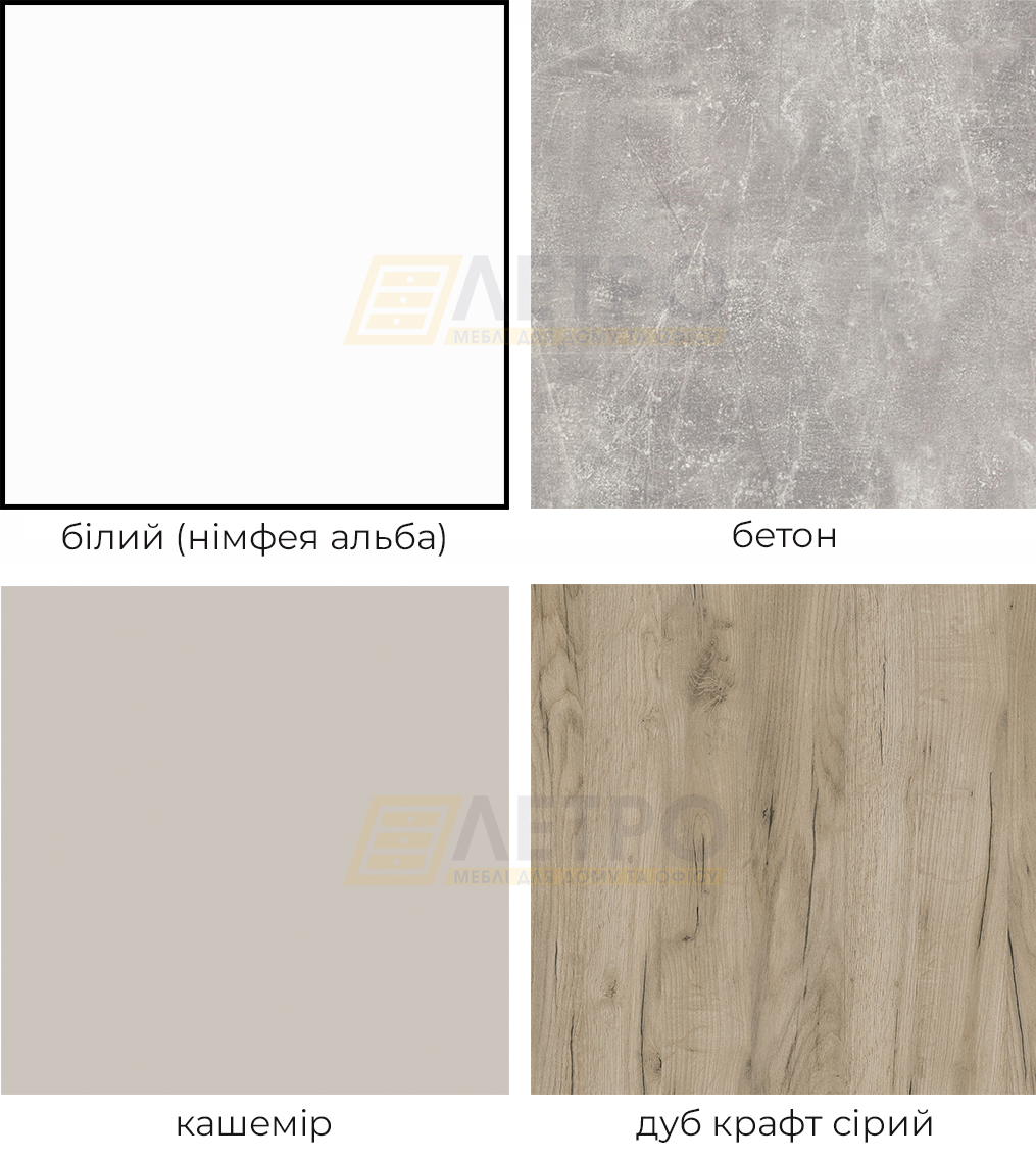 | Колір (відтінок) меблів | Кашемір + Дуб крафт сірий, Кашемір, Бетон, Дуб крафт сірий, Білий |