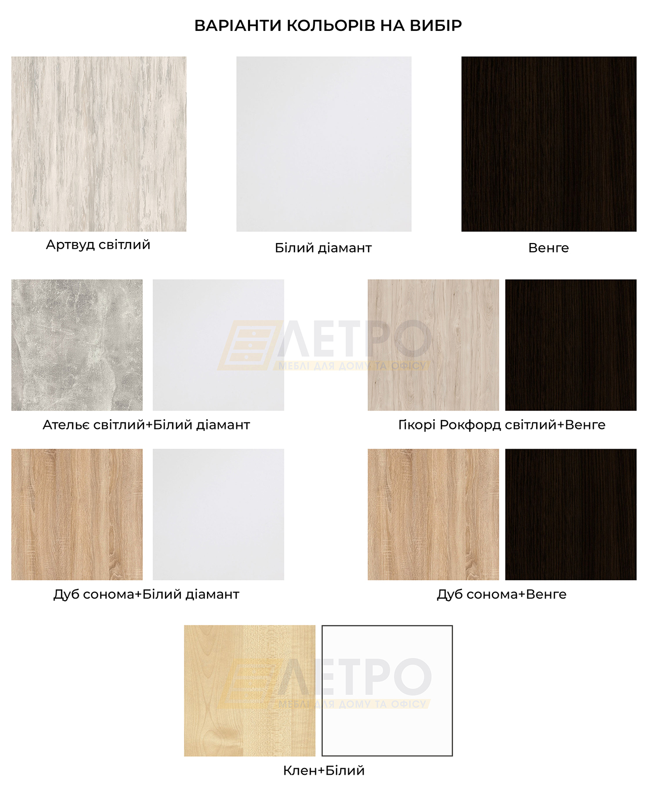 Колір (відтінок) меблівАртвуд Світлий, Ательє Світлий, Дуб сонома + білий, Дуб сонома, Дуб сонома + венге, Білий, Клен