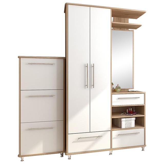 Сучасний місткий передпокій для маленького коридору Ніагара довжиною 113 см і глибиною 38 см фабрики Сокме. Виготовляється з ламінованого ДСП класу Е1 (не містить шкідливих для людини клеїв і смол), у двох варіантах комбінацій кольорів: дуб сонома і білий або дуб сонома і венге. До передпокою можна замовити високу тумбу для взуття з горизонтальним способом зберігання. Містить дводверну шафу з виїзною штангою для верхнього одягу, виїзні шухляди для дрібних речей, відкриті полиці та дзеркало. Передпокій Ніагара хороший варіант для маленького вузького коридору.