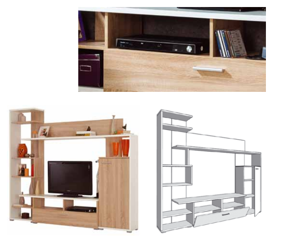 Вітальня ASTRA VMV Holding – комплект меблів у вітальню АСТРА від фабрики BMB Холдинг. Виготовляється з ламінованої ДСП в приємному колірному поєднанні білий титан / дуб сонома. Характеризується оригінальним дизайном і компактними розмірами. Використовуються петлі Hettich.