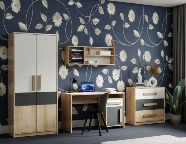 До складу комплекту входить письмовий стіл із висувною тумбою, оснащеною шухлядою і закритим відділенням для канцелярського приладдя. Навісна полиця зручна для розміщення книг і навчальних матеріалів. Для зберігання одягу передбачена дводверна шафа з полицями і штангою. Доповнює комплект комод із трьома шухлядами, в яких зручно розміщувати білизну та дрібні речі.